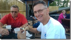 We combined two of our favorite things by stopping at a local eatery for our first michigan hot dogs of the year. (A michigan is like a chili dog but without the beans. The sauce is spicy and finely ground, and usually served with mustard and onions “buried”.) I think we worked our michigans off on our 21 mile bike ride.